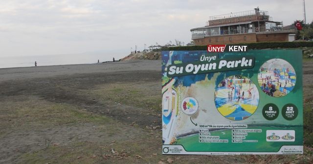 Ünye Atatürk Parki yanindaki kumsala çocuklar için su parki projesi uygulamayi planlayan Ordu Büyüksehir Belediyesi, alana yerlestirdigi panoda proje görselinin Ünyelilerin begenisine sundu.