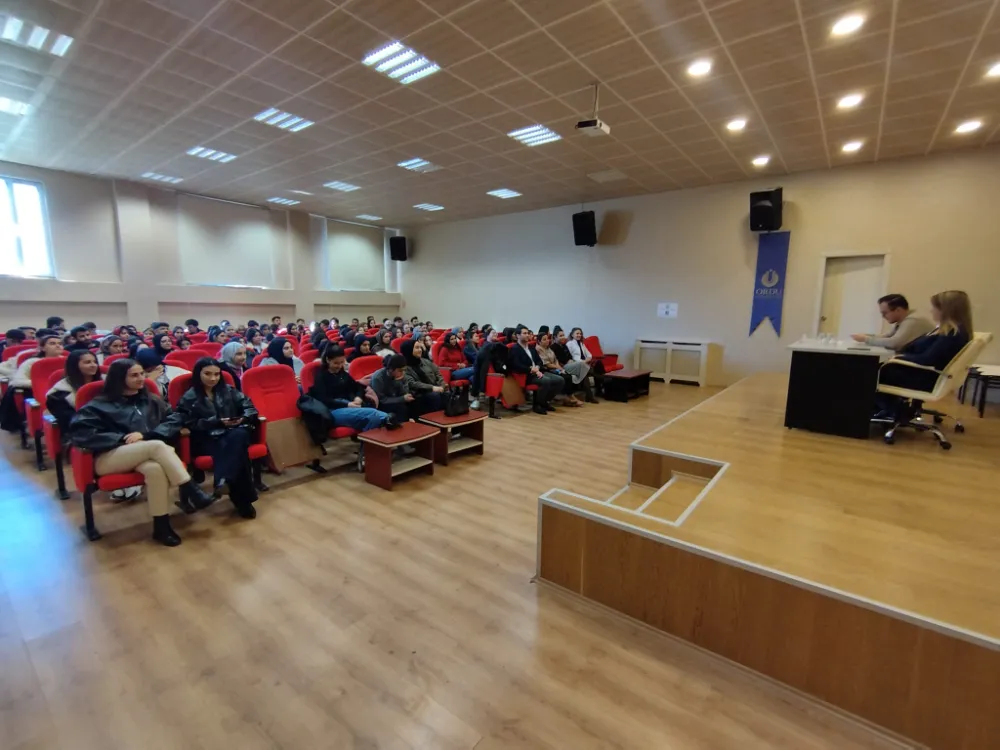 Meslek Yüksekokulu konferans salonunda gerçekleştirilen söyleşiye, Ordu Özel Cumhuriyet Bakım Merkezi Müdürü Mert Daşkın konuk oldu.