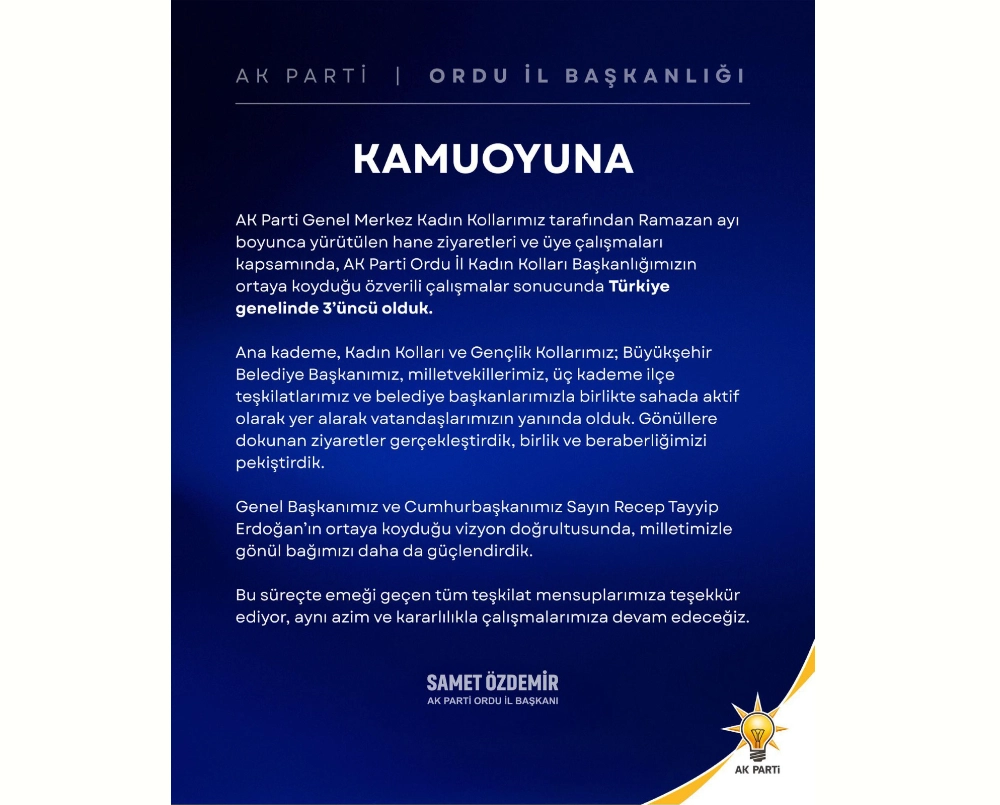 AK Parti Ordu İl Başkanı Samet Özdemir, Ramazan ayı boyunca yürütülen hane ziyaretleri ve üye çalışmaları kapsamında, Ordu İl Kadın Kolları Başkanlığı’nın Türkiye genelinde 3’üncü olduğunu duyurdu.