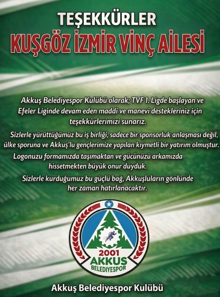 "Takımımızın bugünlere gelmesinde önemli pay sahibi olan isim sponsorumuz Kuşgöz İzmir Vinç ailesine destekleri için teşekkür ediyoruz. Sizlerle yürüttüğümüz bu iş birliği sadece bir sponsorluk anlaşması değil, ülke sporuna ve Akkuşlu gençlerimize yapılan kıymetli bir yatırım olmuştur. Logonuzu formamızda taşımaktan büyük onur duyduk. Sizlerle kurduğumuz bu güçlü bağ, Akkuşluların gönlünde her zaman hatırlanacaktır."