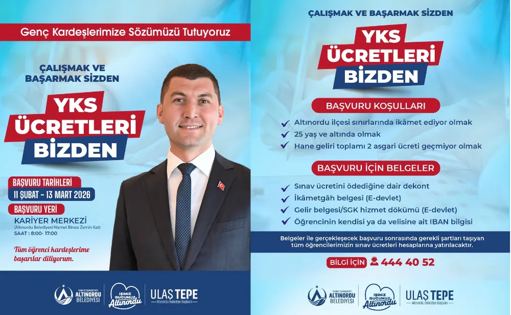 Seçim döneminde YKS başvuru ücretlerinin belediye tarafından karşılanacağı yönünde taahhütte bulunan Altınordu Belediye Başkanı Tepe, YKS başvuru sürecinin başlamasıyla birlikte uygulamanın detaylarını kamuoyuyla paylaştı. Buna göre başvuru işlemlerini tamamlayan üniversite adaylarının sınav ücretleri, 13 Mart 2026 tarihine kadar belediye tarafından ödenecek.