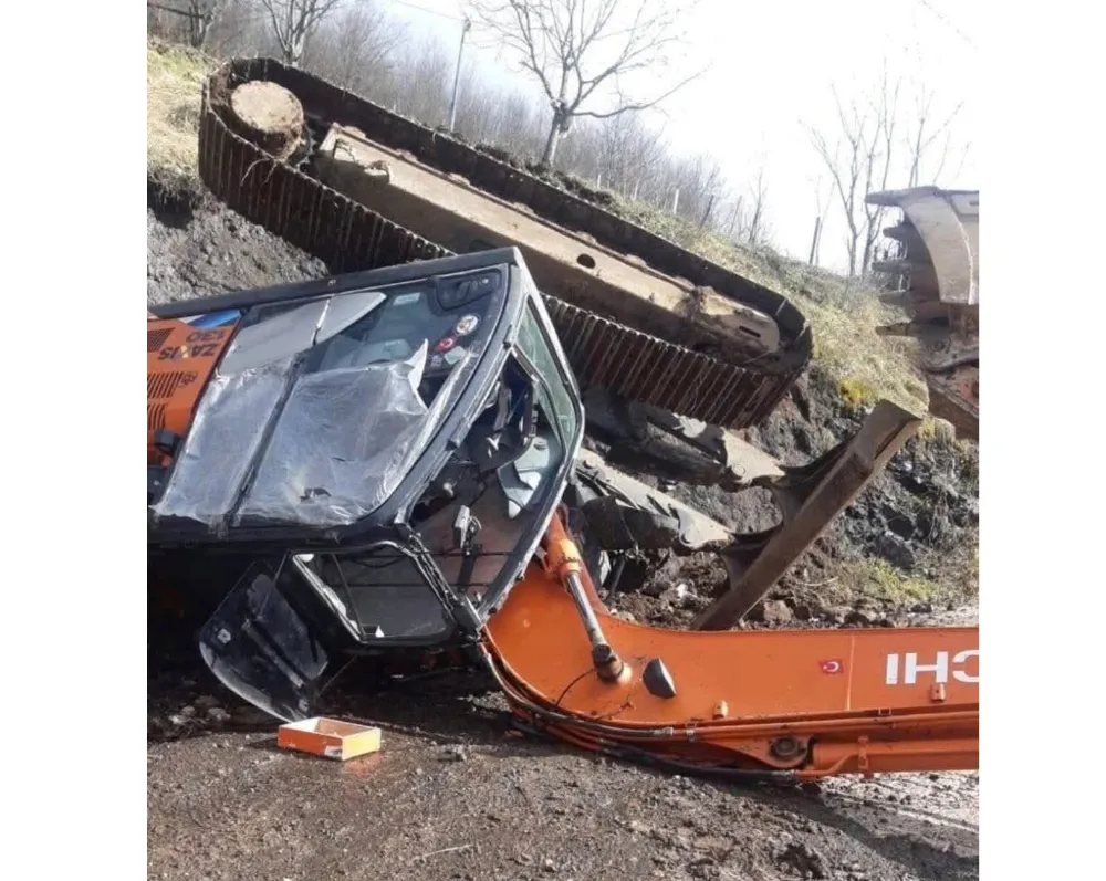 Devrilen iş makinesinin operatörü yaralanırken, ihbar üzerine olay yerine sağlık ekipleri sevk edildi.