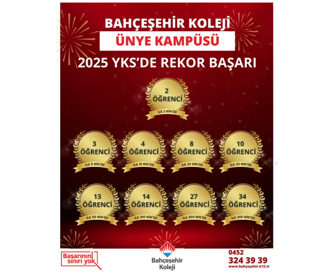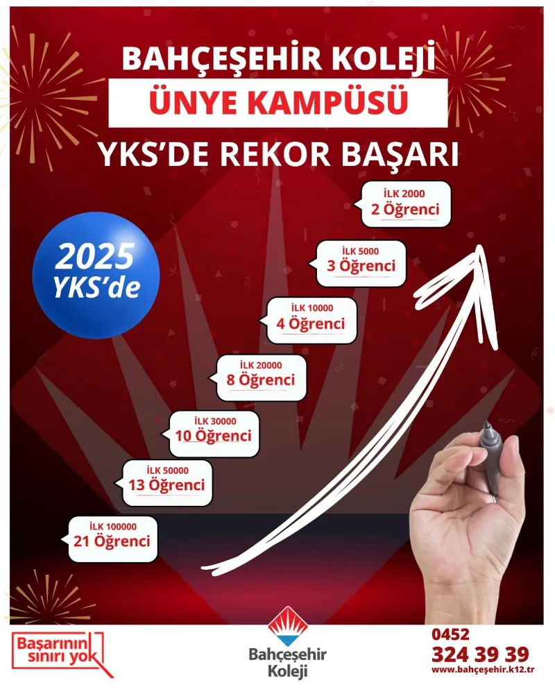Bahçeşehir Koleji Ünye Kampüsü, 2025 Yükseköğretim Kurumları Sınavı (YKS) sonuçlarına göre 112 öğrencisiyle büyük bir başarıya imza atarak adından bir kez daha söz ettirdi.