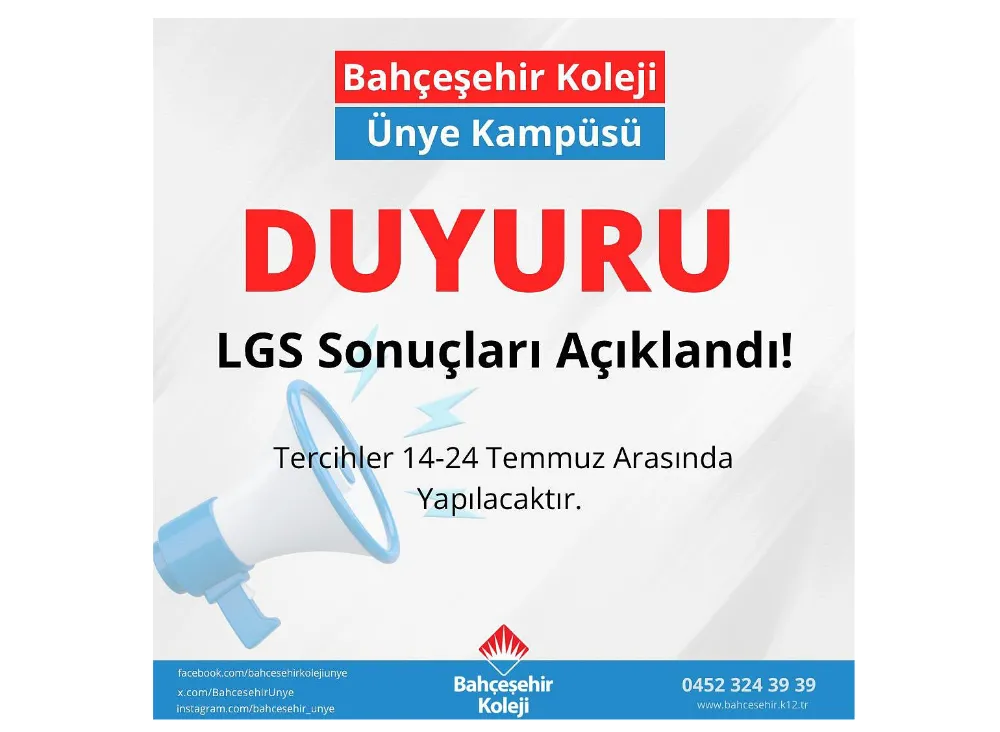 “Bahçeşehir Koleji Ünye Kampüsü olarak, LGS sonrası tercih döneminde öğrencilerimizin yanında olmaya devam ediyoruz. Tercih ve Tanıtım Ofislerimiz, LGS’ye giren tüm öğrencilerin katılımına açıktır. Bölgedeki en güçlü akademik kadromuzla, lise tercihlerinizi yaparken doğru kararlar almanıza destek oluyoruz. Öğrencilerimize başarılar diler, tercih sürecinde tüm adayların yanında olduğumuzu hatırlatmak isteriz.”