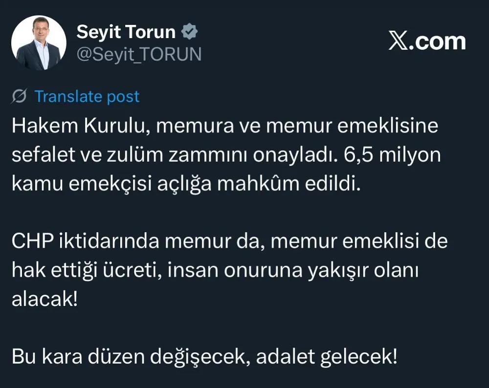 Kararın milyonlarca kişiyi mağdur ettiğini vurgulayan Torun, ““Memur ve emekli insan onuruna yakışır yaşamı hak ediyor. 6,5 milyon kamu emekçisi açlığa mahkûm edildi.” ifadelerini kullandı.