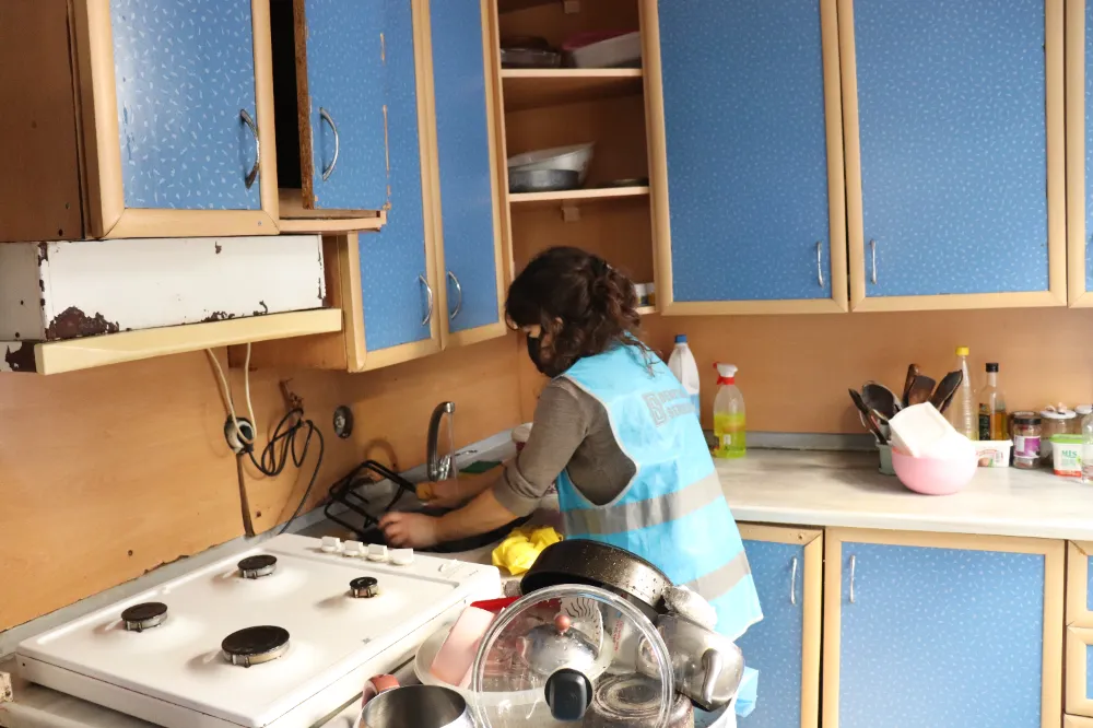 Çalışmalar kapsamında evin banyosu ve tüm odaları detaylı şekilde temizlenirken, halılar süpürülüp silindi, ev eşyaları düzenlenerek daha kullanışlı hale getirildi.