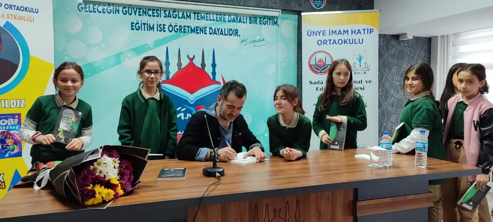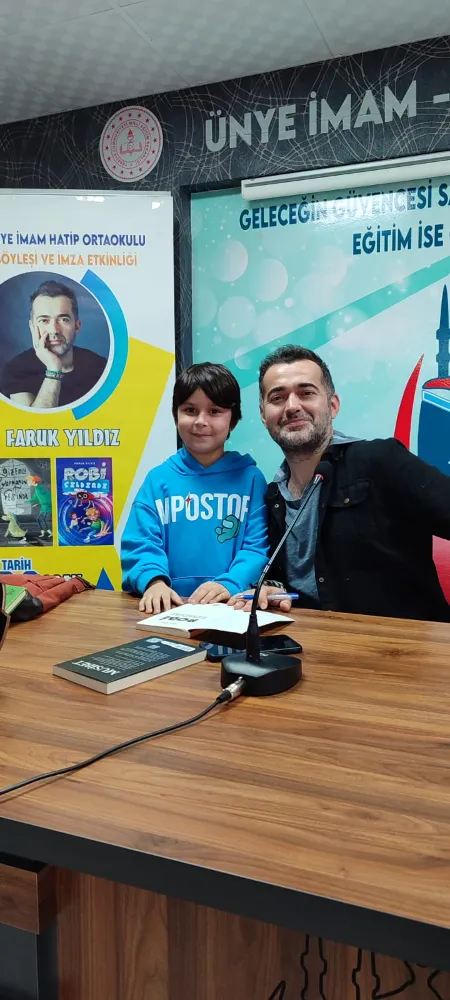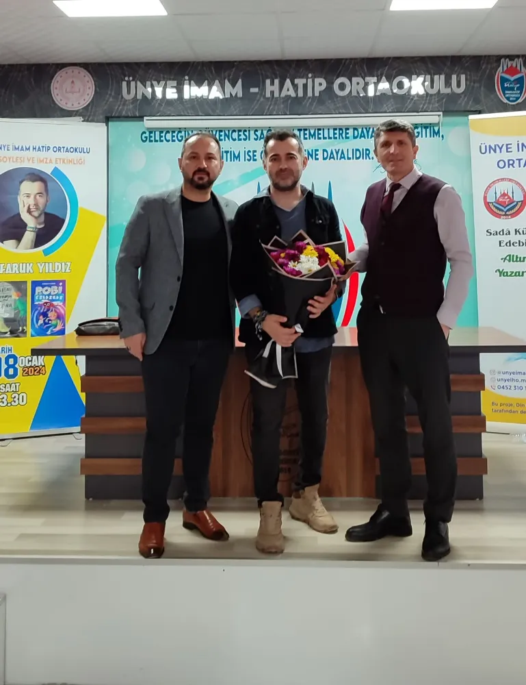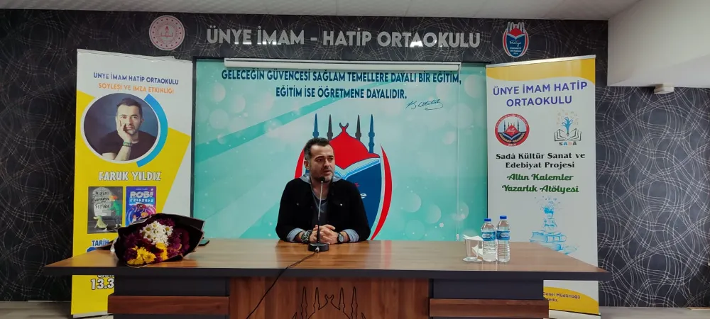 Din Öğretimi Genel Müdürlüğü’nün Sada Kültür Sanat ve Edebiyat Projesi kapsamında Ünye İmam Hatip Ortaokulunda kurulan Altın Kalemler Yazarlık Atölyesi faaliyetleri çerçevesinde Yazar Faruk Yıldız, söyleşi ve imza gününde öğrencilerle bir araya geldi.