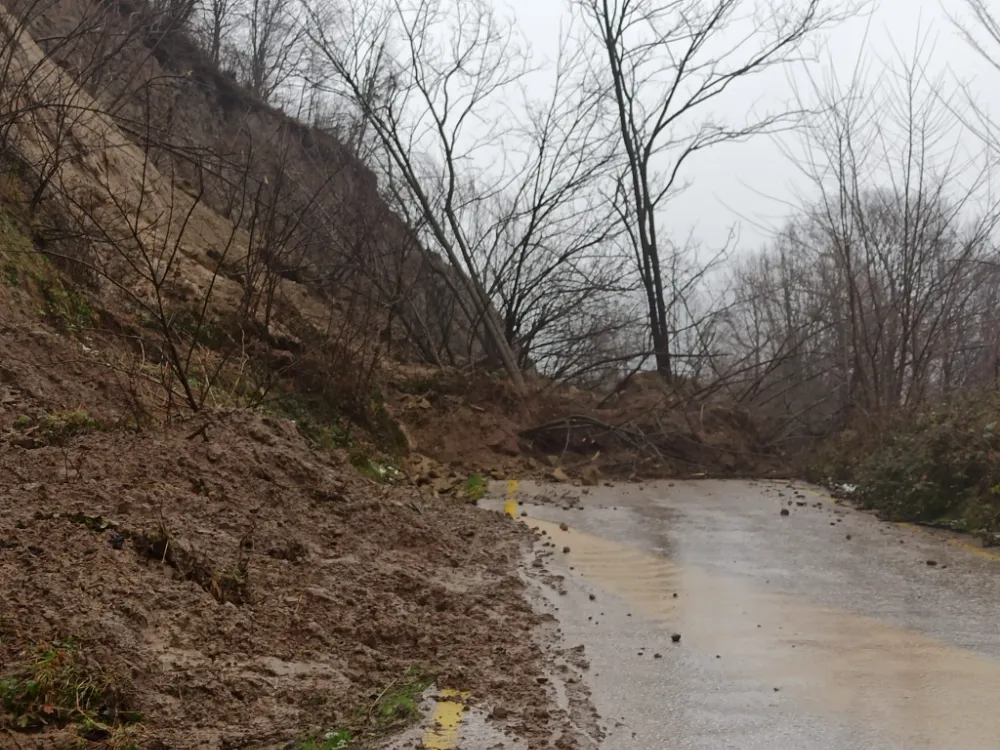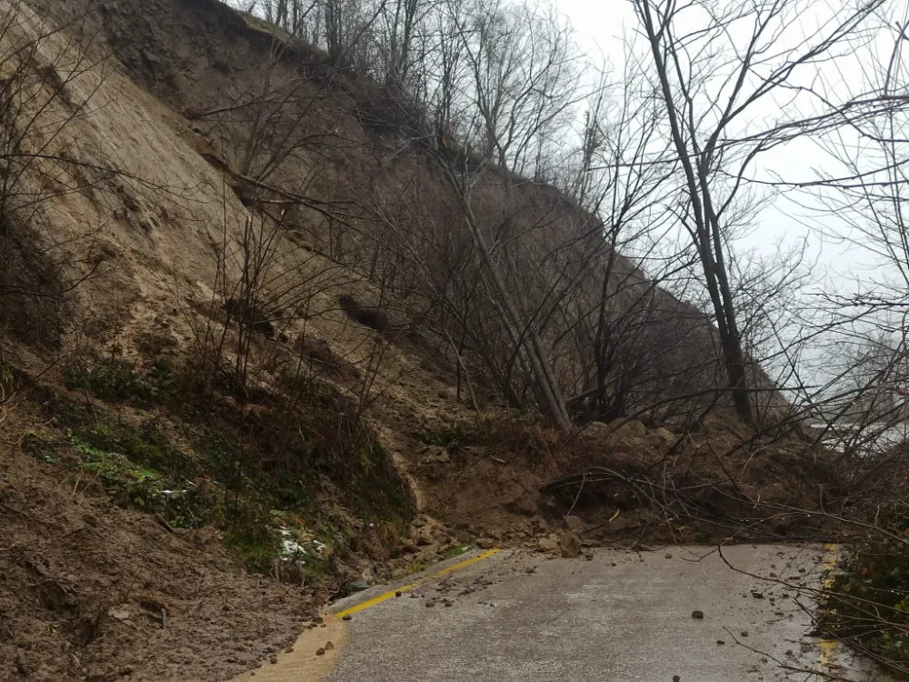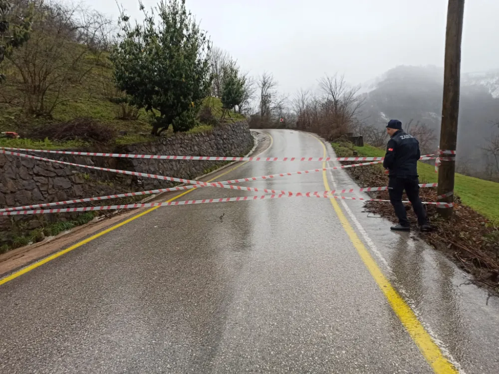 Yamaçtan kopan toprak kütleleri, beraberindeki ağaçları da sürükleyerek karayoluna taşıdı.