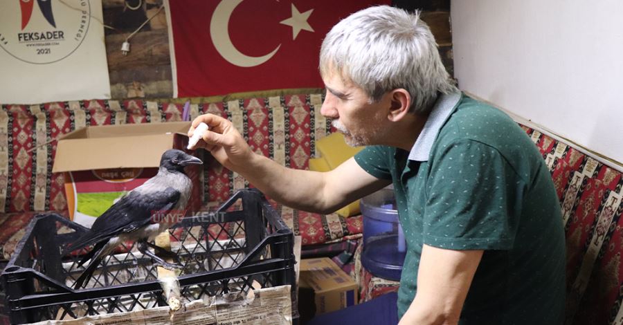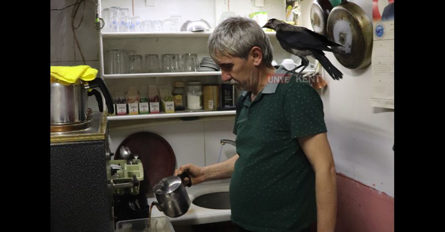 Ünye’nin Fevzi Çakmak Mahallesi Fevzi Çakmak Caddesi’nde 4 yıldır çay ocağı işletmeciliği yapan Adem Kaya, bir arkadaşı aracılığıyla tek gözü görmeyen yaralı 1 aylık karga yavrusunun tedavi ve bakımını üstlendi. Adem Kaya ile yavru karga arasında geçen 2 aylık süreçte oluşan bağ ise görenleri şaşırtmaya başladı.