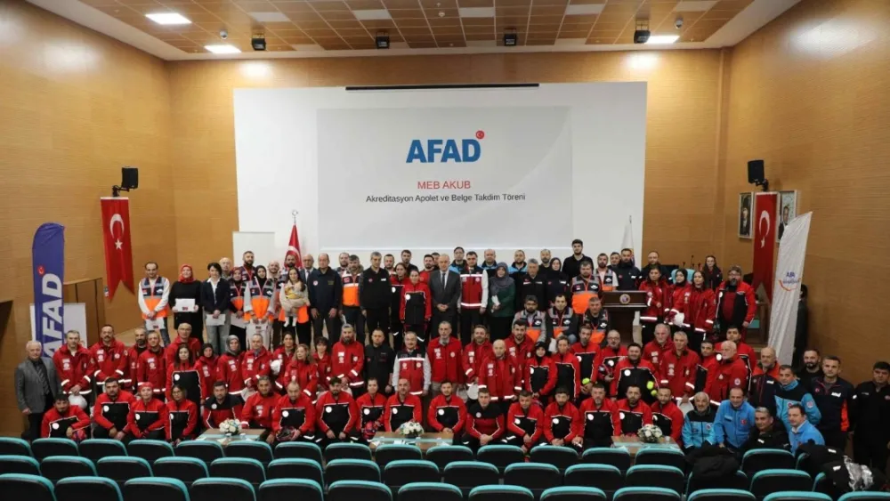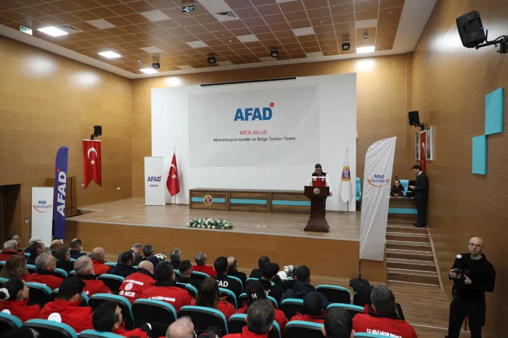 AFAD Akreditasyon Sistemi kapsamında Afetlerde Acil Barınma Akreditasyonunu başarıyla tamamlayan İl Millî Eğitim Müdürlüğü Arama Kurtarma Birimi (AKUB) ekibine Akreditasyon Arması, eğitimlerini tamamlayan Destek AFAD Gönüllülerine ise kimlik belgeleri düzenlenen törenle verildi.