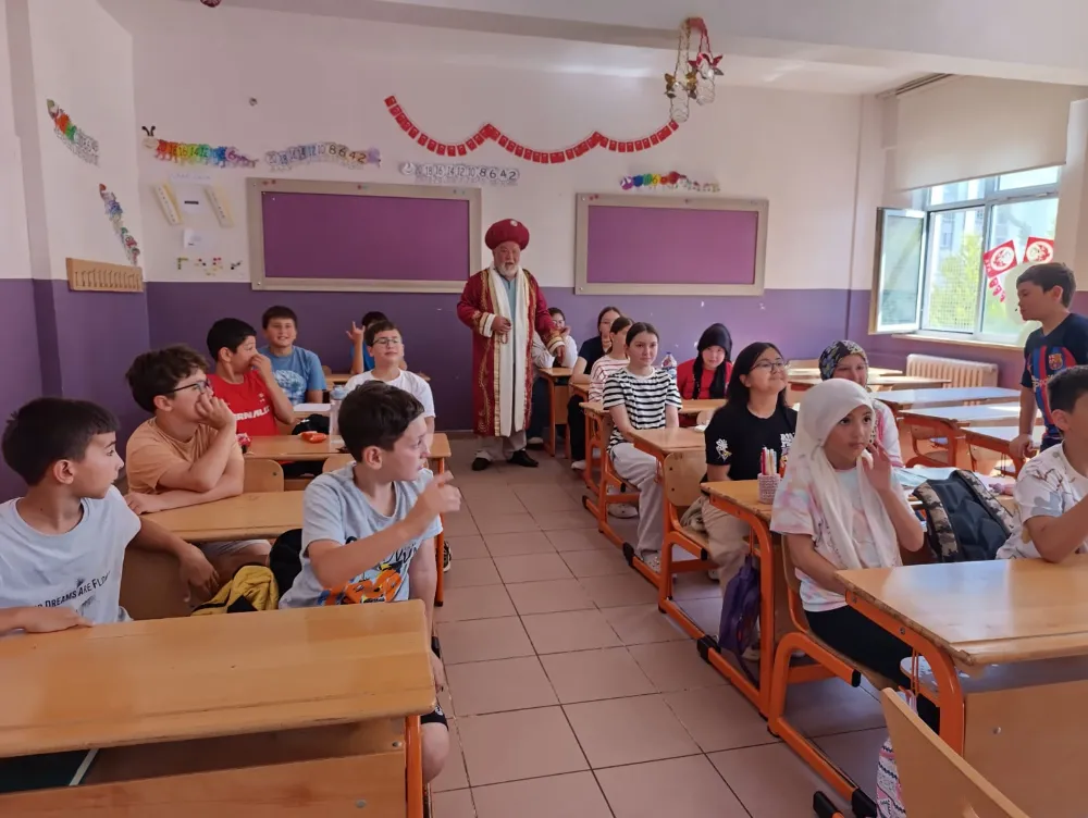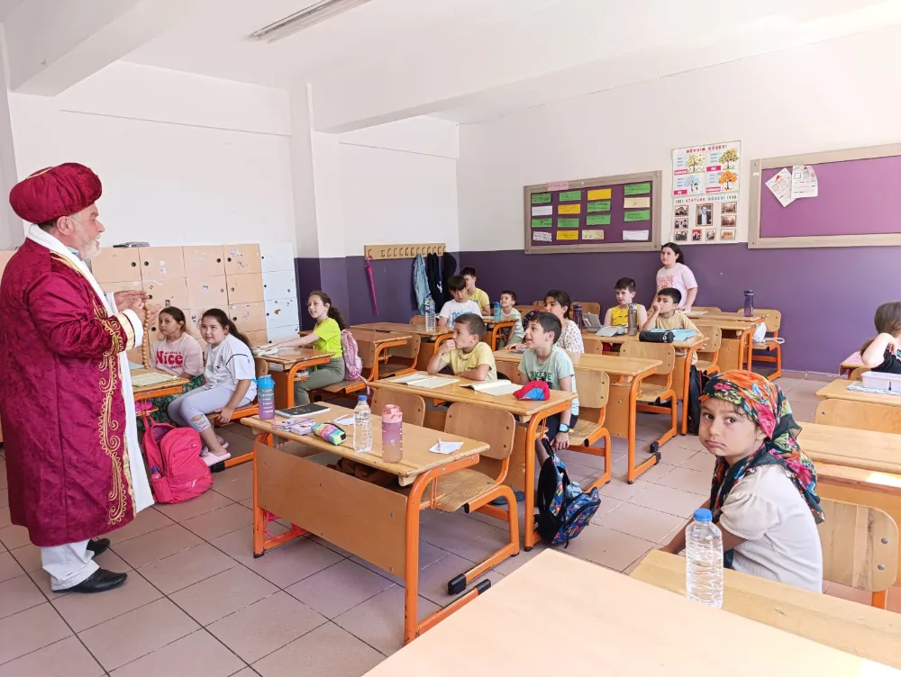 Anafarta İlkokulu'nda eğitim gören yaz okulu öğrencileri, geleneksel kıyafetleriyle sınıfları tek tek gezen Ateş’i karşılarında görünce şaşkınlık yaşadı. Yanında getirdiği tepsiyle öğrencilere çeşitli ikramlar dağıtan Ateş, esprili anlatımı ve Nasrettin Hoca fıkralarıyla sınıflarda keyifli anlar yaşattı.
