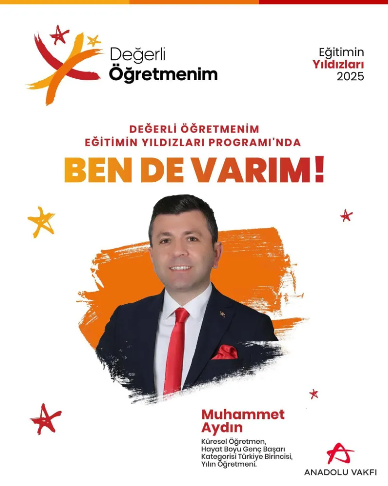 Muhammet Aydın, Anadolu Vakfı ile Prof. Dr. Selçuk Şirin iş birliğinde 12 yıldır sürdürülen ve Türkiye’nin ilham verici eğitim buluşmalarından biri olarak gösterilen “Değerli Öğretmenim – Eğitimin Yıldızları Programı” kapsamında düzenlenen “Eğitimin Yıldızları Zirvesi”ne davet edildi. Aydın, zirve programında “Fark Yaratan Öğretmen” konulu panelde konuşmacı olarak yer aldı.