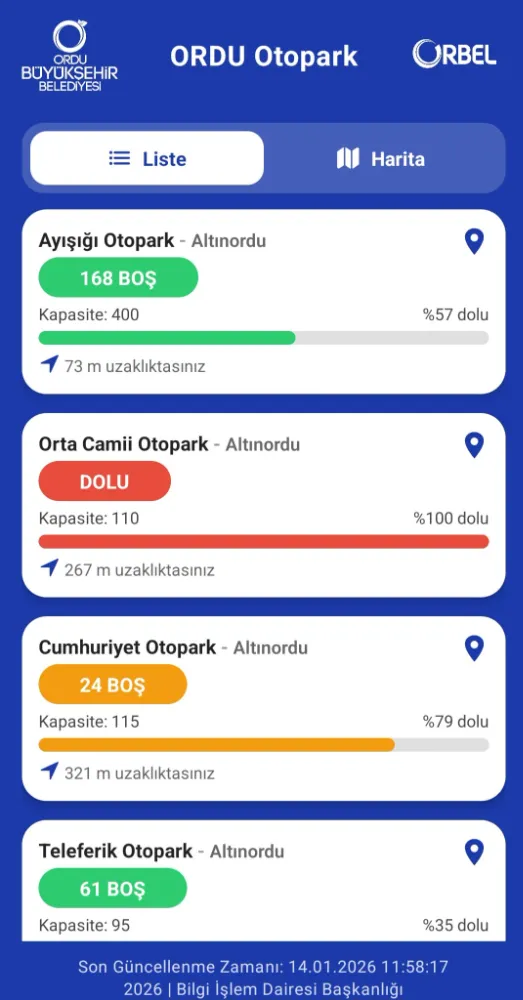“Ordu Otopark” mobil uygulaması üzerinden Ayışığı Otopark, Orta Camii Otopark, Cumhuriyet Otopark, Öğretmen Evi Otopark, Teleferik Otopark, Tenis Otopark ve Ünye Merkez Otoparklarının doluluk ve boşluk durumları anlık olarak takip edilebiliyor.