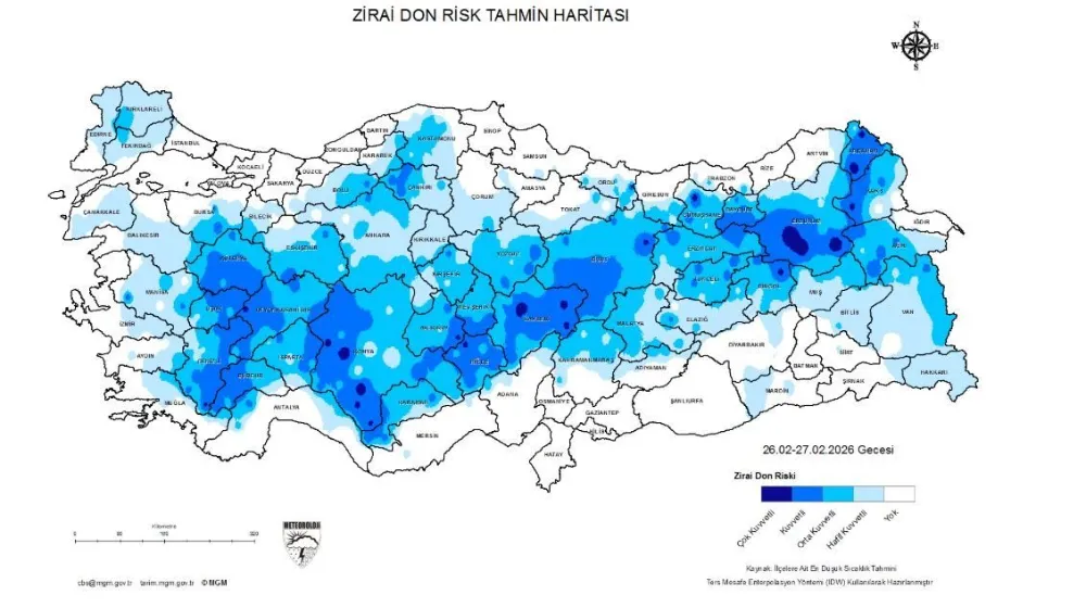 Zirai Don Risk Tahmin Haritası'na göre, il genelinde sıcaklıkların mevsim normallerinin altına düşmesiyle birlikte özellikle yüksek kesimlerde kuvvetli don olayı bekleniyor.