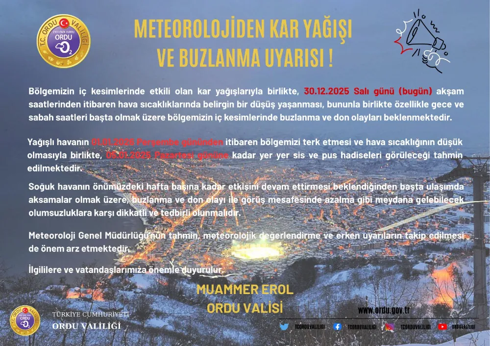 Vali Erol, bölgemizin iç kesimlerinde devam eden kar yağışlarıyla birlikte 30 Aralık 2025 Salı günü akşam saatlerinden itibaren hava sıcaklıklarında belirgin bir düşüş yaşanmasının beklendiğini belirterek, özellikle gece ve sabah saatlerinde buzlanma ve don olaylarının görülebileceğini ifade etti.