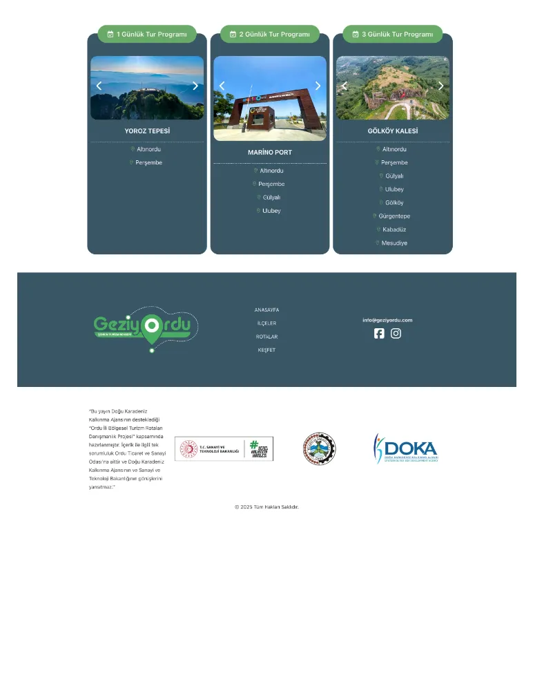 Bu doğrultuda, söz konusu çalışma Ordu Ticaret ve Sanayi Odası Proje Ofisi tarafından tasarlanmış ve kaleme alınmıştır. Hazırlanan proje, Doğu Karadeniz Kalkınma Ajansı Sürdürülebilir Turizm Teknik Destek Programı kapsamında desteklenmiş olup “Ordu İli Bölgesel Turizm Rotaları Projesi” adıyla yürütülmüştür. Proje sonucunda oluşturulan www.geziyordu.com adresi, turizm sektör temsilcileri ile paylaşılmıştır.