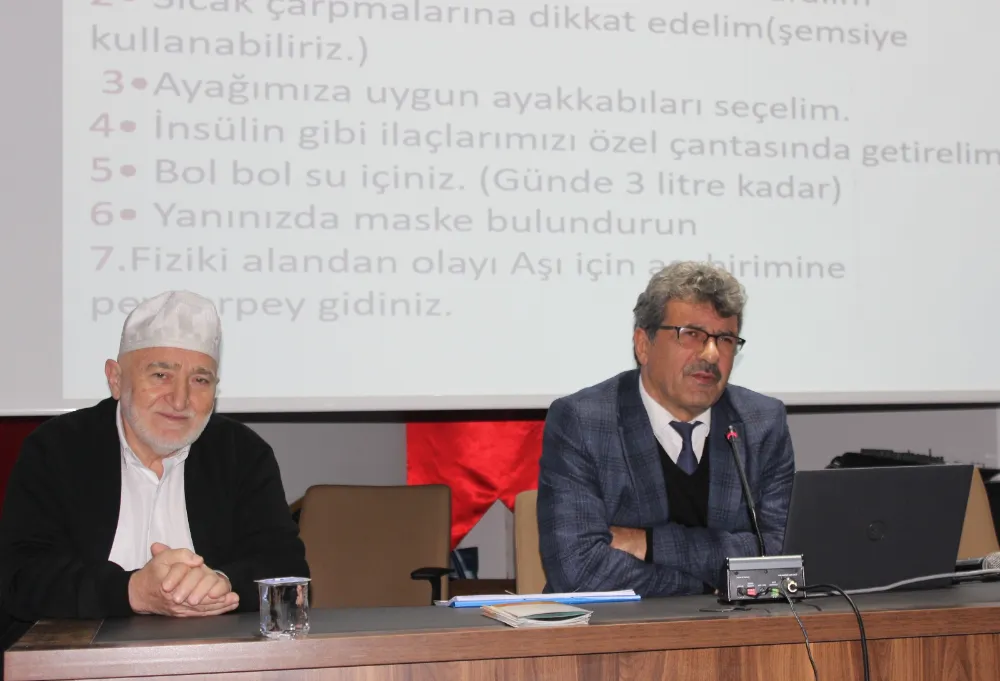 Seminerin son bölümünde İlçe Sağlık Müdürlüğü personeli Ahmet Yıldıran, Umre süresince dikkat edilmesi gereken sağlık kuralları, hijyen, beslenme ve olası rahatsızlıklara karşı alınacak önlemler konusunda sunum yaptı.