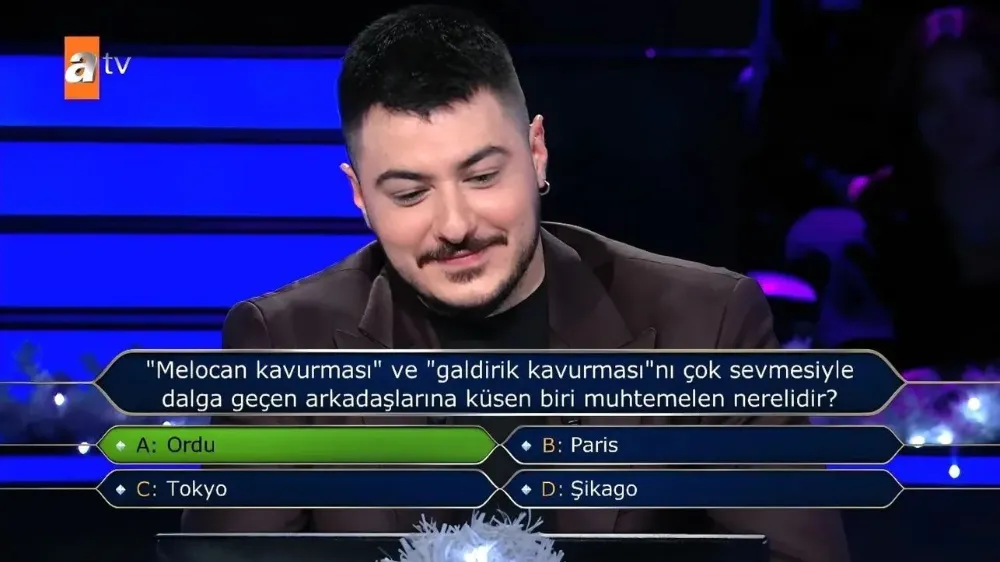 Özellikle Ordulu izleyiciler tarafından merakla takip edilen soruda Semicenk, “Melocan kavurması” ve “galdirik kavurması”nı çok sevmesiyle dalga geçen arkadaşlarına küsen biri muhtemelen nerelidir? sorusuna ‘Ordu’ yanıtı vererek memleketine olan bağlılığını bir kez daha ortaya koydu.
