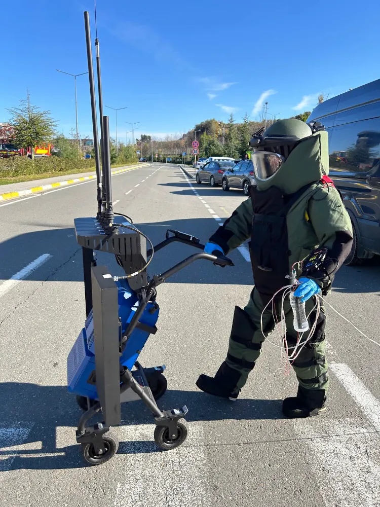 Özel kıyafetli bomba imha uzmanları tarafından kontrollü şekilde müdahale edilen şüpheli valiz, güvenlik önlemleri alınarak imha edildi.