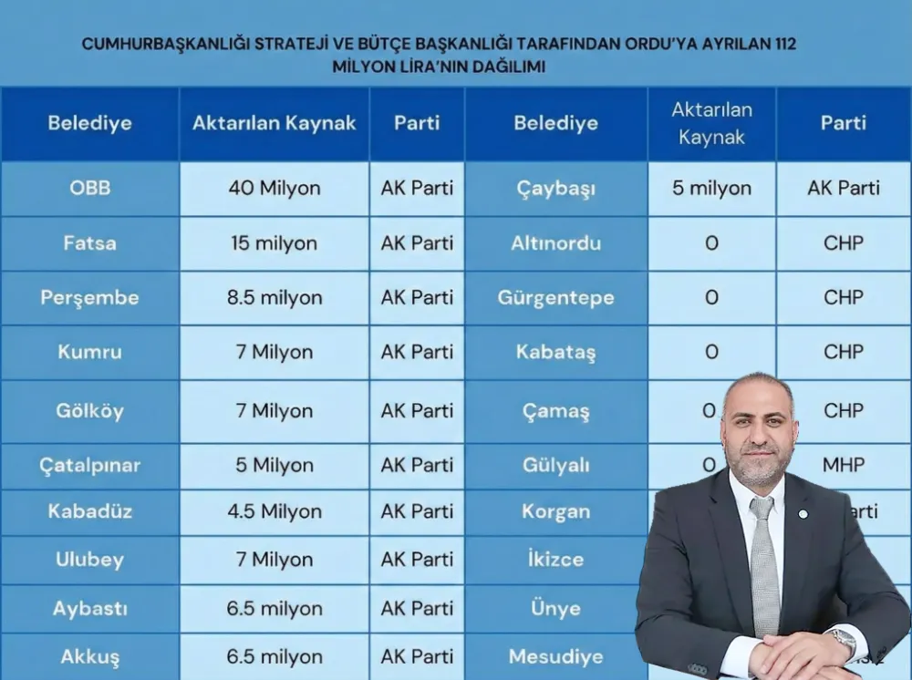 İYİ Parti Ordu İl Başkanı Fatih Titiz, Cumhurbaşkanlığı Strateji ve Bütçe Başkanlığı tarafından Ordu’ya aktarılan 112 milyon TL’lik ödeneğin dağıtımına ilişkin yazılı bir açıklama yaparak, söz konusu kaynağın yalnızca AK Partili belediyelere verilmesini eleştirdi.