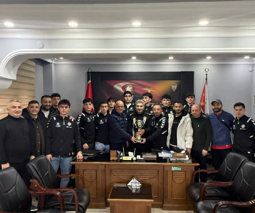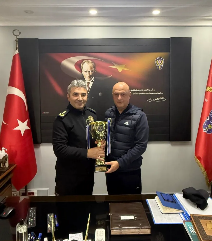 Kulüp yönetimi, teknik heyet ve sporcuların katıldığı ziyarette, şampiyonluk kupası Emniyet Müdürü Sarısoy’a takdim edildi.