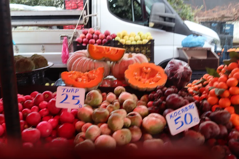 Havuç 25 TL, brokoli 50 TL, mandalina 25 TL, yeşil biber 100 TL, elma 50 TL, muz 75 TL, karnabahar 35 TL, portakal 25 TL, pırasa 25 TL, patlıcan 125 TL, patates (5 kg) 100 TL, salatalık 120 TL, fasülye 200 TL, ayva 150 TL, marul 25 TL, turp 25 TL, mantar 200 TL, domates 100 TL, kabak 50 TL, nar 100 TL