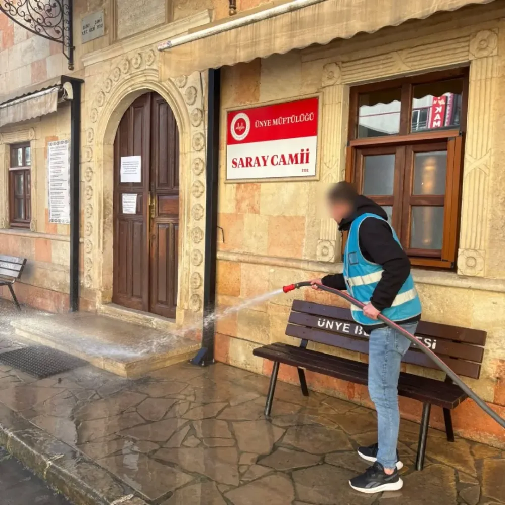 Ünye ilçesinde, kamu hizmeti cezası bulunan yükümlüler, ilçe merkezindeki camileri ramazan ayına ve teravih namazlarına hazırlıyor.