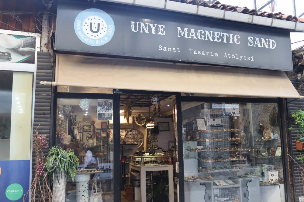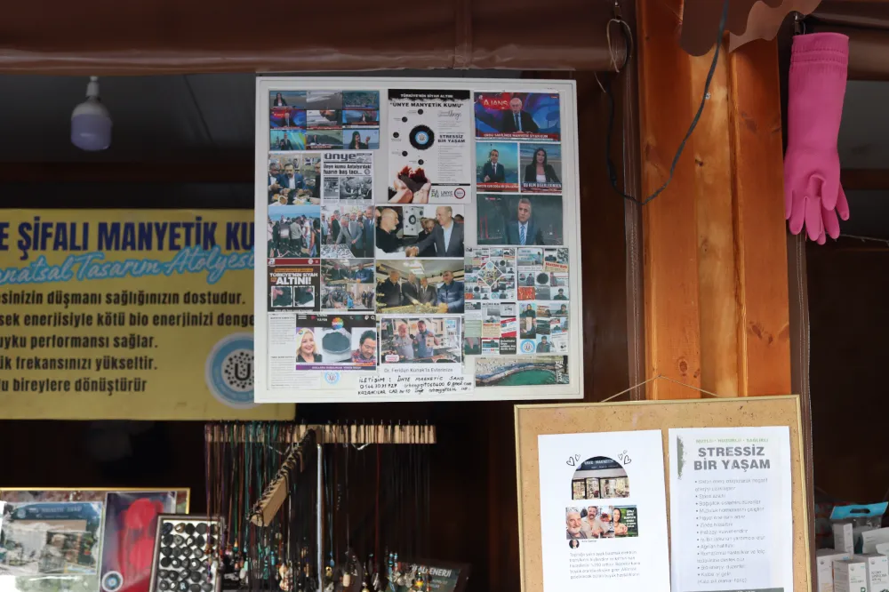 “Beni insanlar kumu keşfeden kişi olarak lanse ediyor. Ünye’nin manyetik kumuyla 7 yıldır takı işini yapıyorum. Ünye manyetik kumu Dünya’da içindeki mineral bakımından en fazla minerale sahip olan mucizevi bir kum. Bu kum 30 kilometrelik sahilimizde bulunmakta. Ünye’nin bir tanıtım görevlisi olarak bütün Türkiye ve Dünya’da ki insanları bu kuma gelmelerini istemekte ve tedavi olup gelip görmelerini istiyorum. Bu kum 20 mineral çeşidiyle çok yüksek frekansa ve enerjiye sahip. Bunun için bu manyetik kumun ya üzerinde yürüyeceksiniz, ya kum banyosu yapacaksınız, ya da manyetik kumdan yaptığımız kolyelerden takacaksınız. Büyük bir Arge çalışması aslında bu, yapım aşamasında çok yüksek bir ısıya maruz kalıyor ve kum taşlaşıyor. Bu ısıdan sonra kum minerallerini kaybetmiyor. Yeni ürünümüz var birde, Ünye’nin manyetik çamuru.”