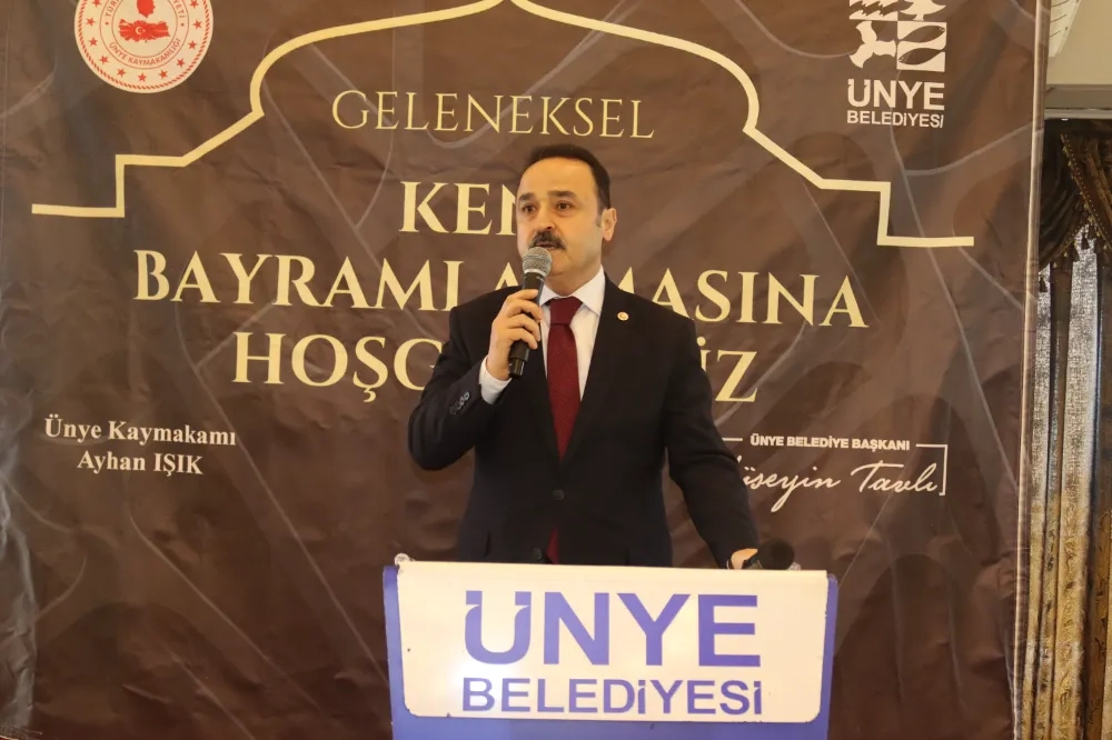 Törende konuşan Ünye Belediye Başkanı Hüseyin Tavlı, Ramazan ayının manevi huzuruyla bayrama ulaştıklarını belirtecek, "Mübarek Ramazan ayının; birlik, beraberlik, kardeşlik, paylaşma ve yardımlaşma duygularının en üst seviyede yaşandığı o güzel süreci layıkıyla tamamlayarak bayrama erişmenin huzurunu ve mutluluğunu yaşıyoruz. Cenab-ı Mevla’dan niyazım; bu birlik ve beraberliğimizin daim olmasıdır." dedi.