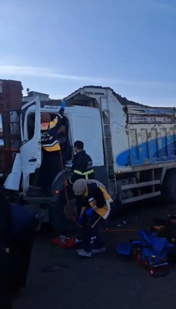 Çarpmanın etkisiyle kamyon sürücüsü araç içinde sıkıştı.