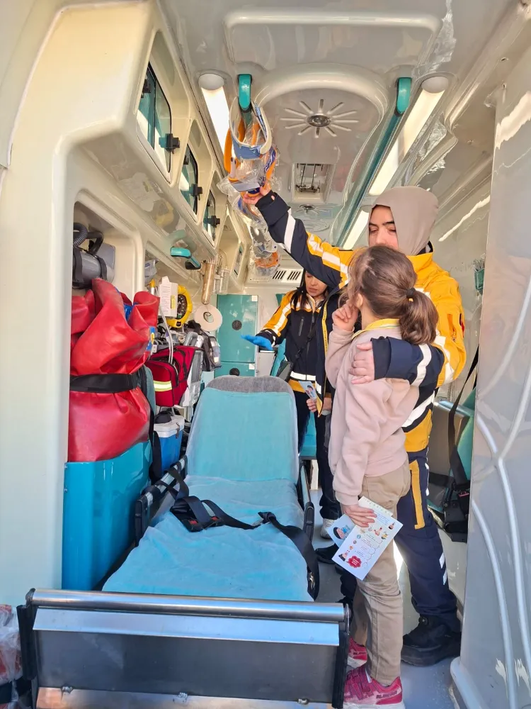 Etkinlik kapsamında 112 Acil Sağlık Hizmetleri personeli tarafından ambulans tanıtımı yapılarak öğrencilere acil durumlarda yapılması gerekenler anlatıldı.
