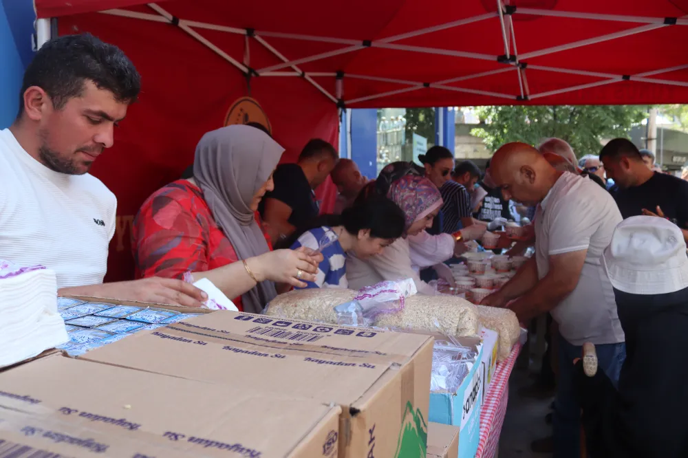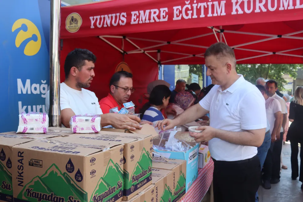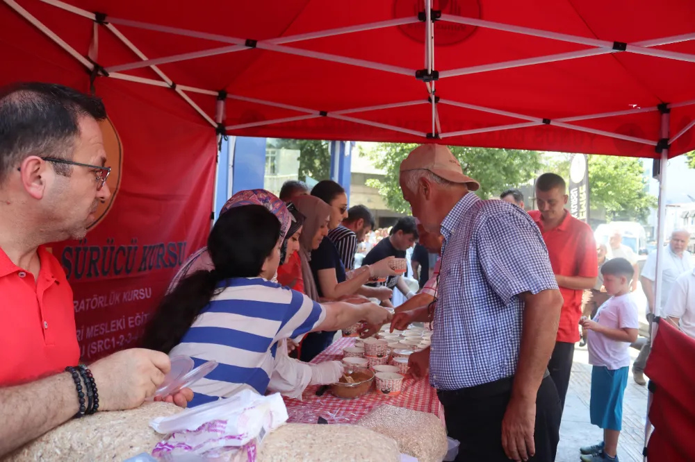 Yunus Emre Eğitim Kurumları Başkanı Kenan Selim Argan, kurs idarecileri ve personelle birlikte cadde üzerinde kurulan stantta vatandaşlara aşure ikramında bulundu.