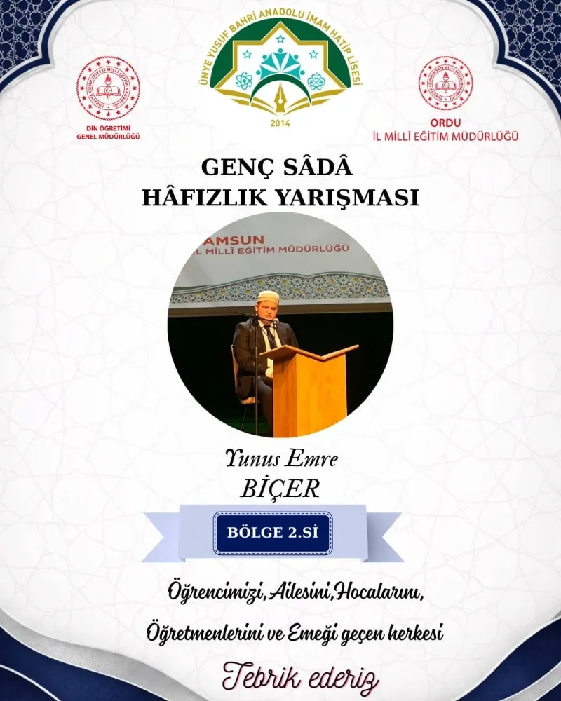 Milli Eğitim Bakanlığı Din Öğretimi Genel Müdürlüğü tarafından Samsun’da düzenlenen "Genç Muhafızlar" Hafızlık Yarışması Karadeniz Bölge Finali’nde, Yusuf Bahri Anadolu İHL öğrencisi Yunus Emre Biçer bölge 2.si oldu.