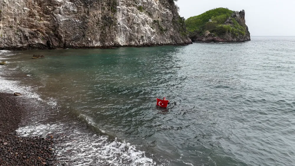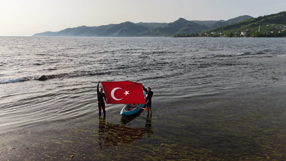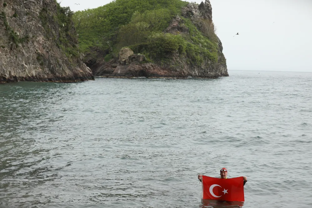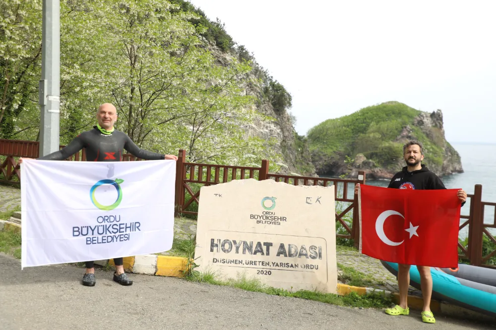 Hoynat Adası’na varan Eroğlu parkur bitişinde günün anlam ve önemini vurgulama için Türk Bayrağı’nı gururla dalgalandırdı.