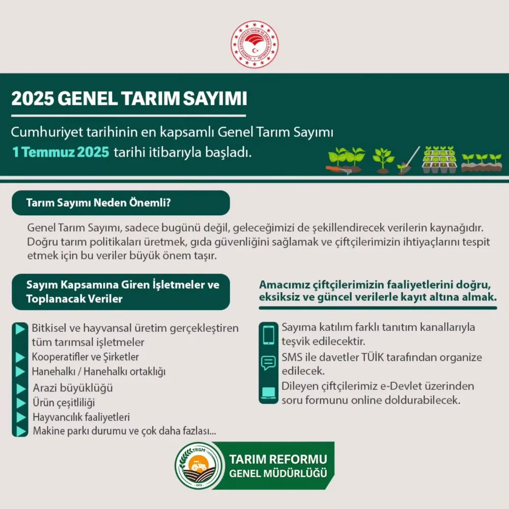 Tarım ve Orman Bakanlığı ile Türkiye İstatistik Kurumu’nun (TÜİK) ortak çalışmasıyla, 2025 yılı Genel Tarım Sayımı resmen başladı. 1 Temmuz 2025 tarihi itibarıyla hayata geçirilen uygulama, Cumhuriyet tarihinin 8. ve en kapsamlı tarım sayımı olma özelliğini taşıyor.