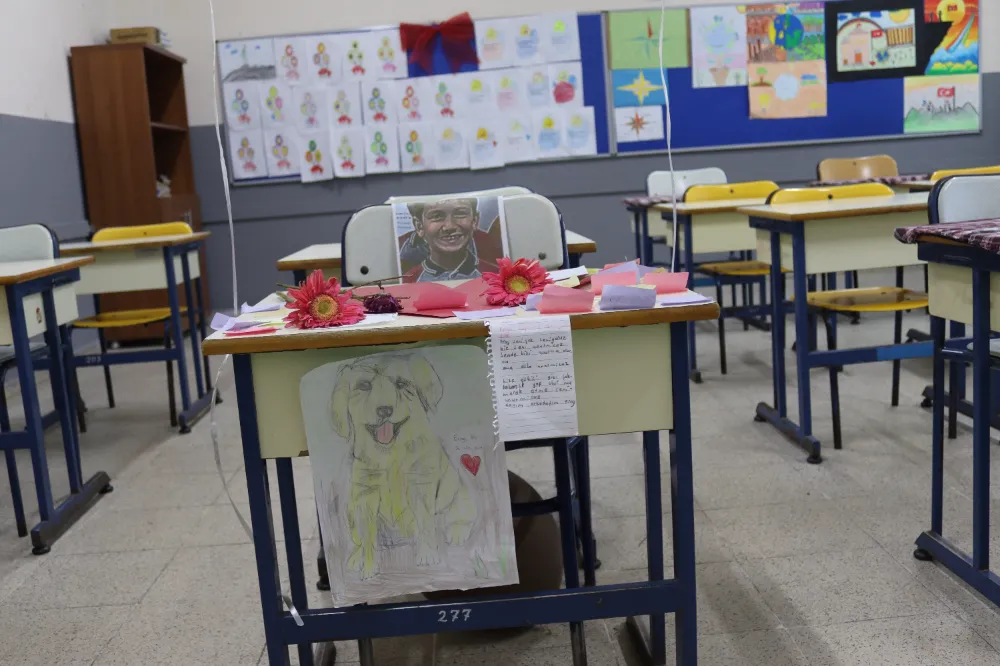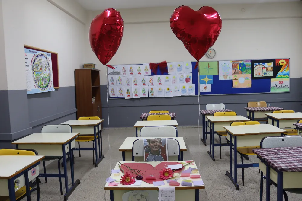Prof. Dr. Necmettin Polvan İlkokulu 4B sınıfında sırasına fotoğrafı bırakıldı, arkadaşları tarafından yazılan duygu dolu mektuplar ve kalp şekilleri masasına yerleştirildi.