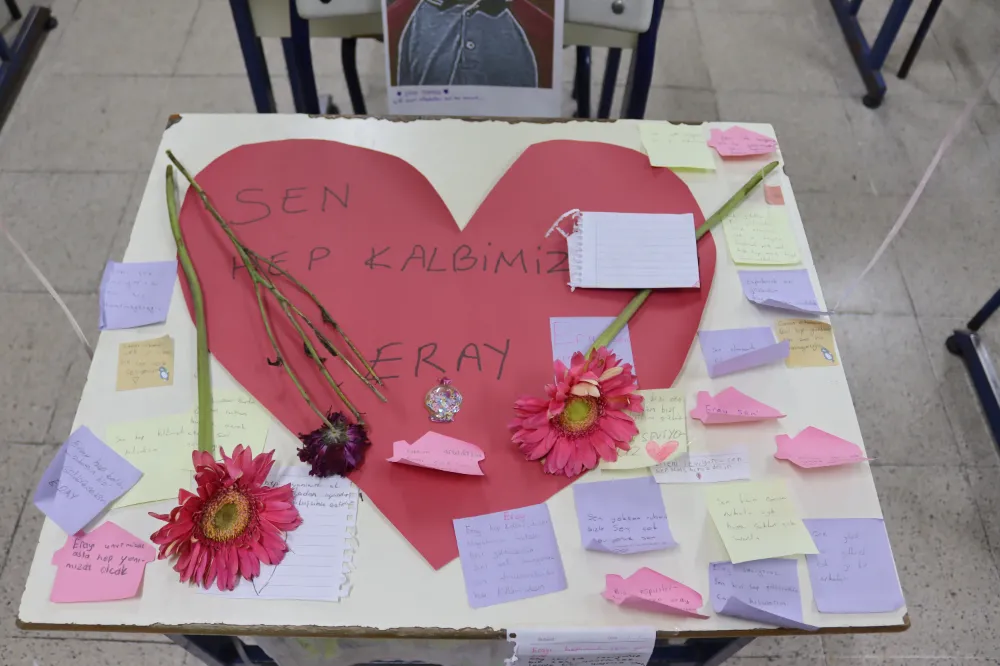 Eray’ın boş kalan sırasına öğrenciler tarafından kalp şeklinde “Sen hep kalbimizdesin” yazılı kart bırakıldı.