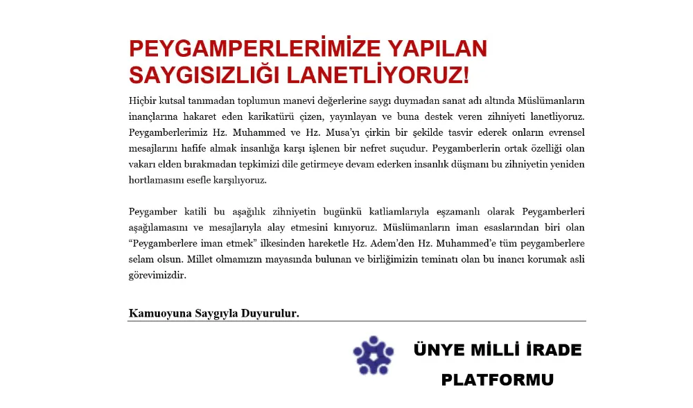 Ünye Milli İrade Platformu, Hz. Muhammed ve Hz. Musa’ya yönelik hakaret içeren karikatürlerin yayınlanmasına yazılı bir açıklamayla tepki gösterdi.