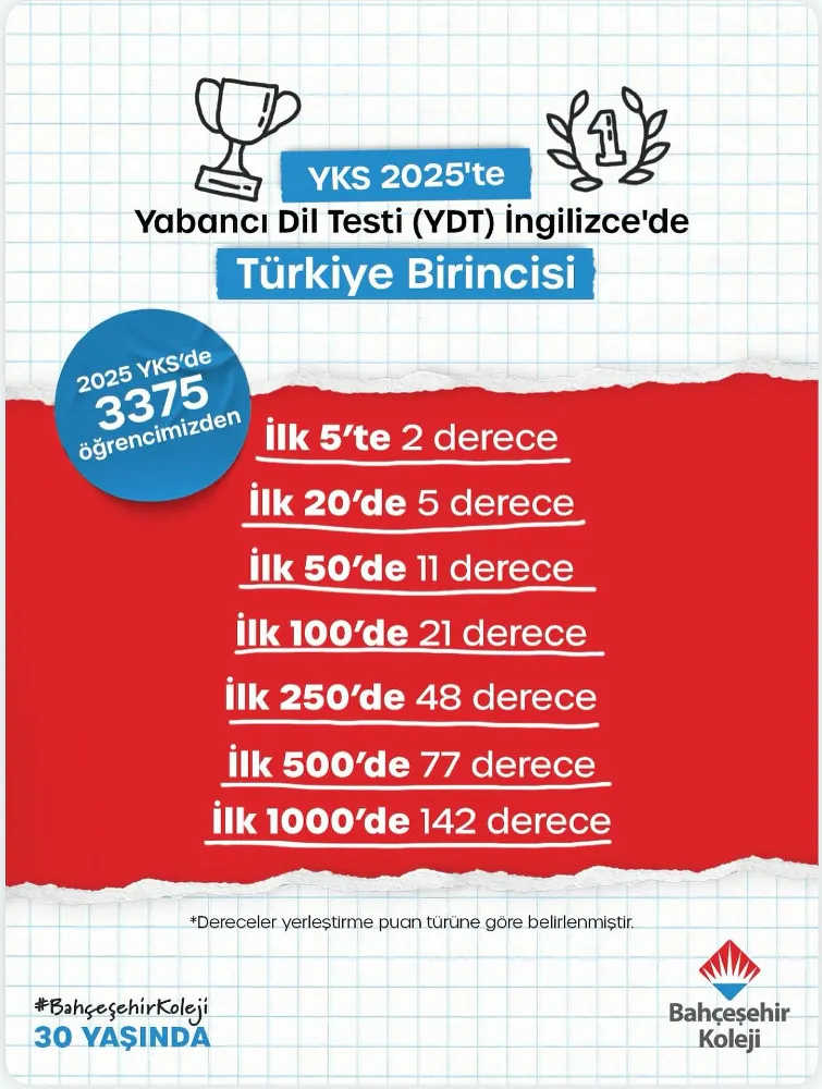 “2025 YKS’de üstün başarı geleneğimizi sürdürmenin gururunu yaşıyoruz. Öğrencilerimiz, azim ve kararlılıkla yürüttükleri çalışmaların karşılığını alarak bizleri bir kez daha onurlandırdı. Bu başarı yalnızca bireysel değil, aynı zamanda okulumuzun uyguladığı YKS Tam Hazırlık Sistemi, disiplinli akademik programlarımız, öğrenciye özel rehberlik hizmetlerimiz ve güçlü öğretmen kadromuzun ürünüdür.