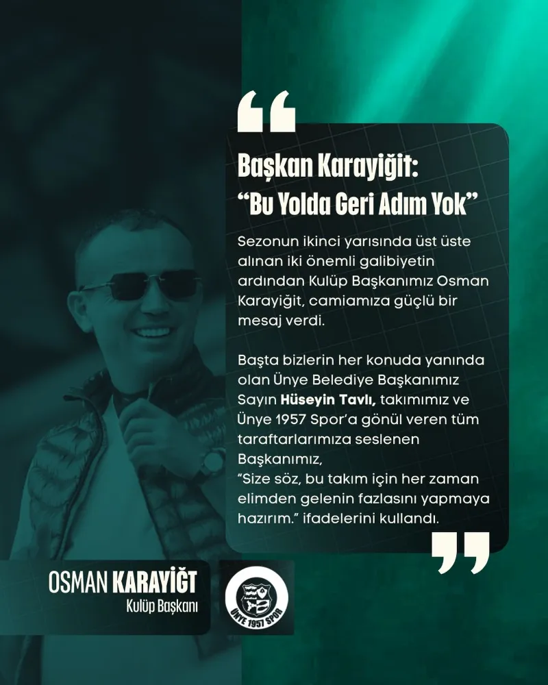 Ünye 1957 Spor Kulübü Başkanı Osman Karayiğit, sezonun ikinci yarısında elde edilen üst üste iki önemli galibiyetin ardından kulüp camiasına birlik ve kararlılık mesajı verdi.