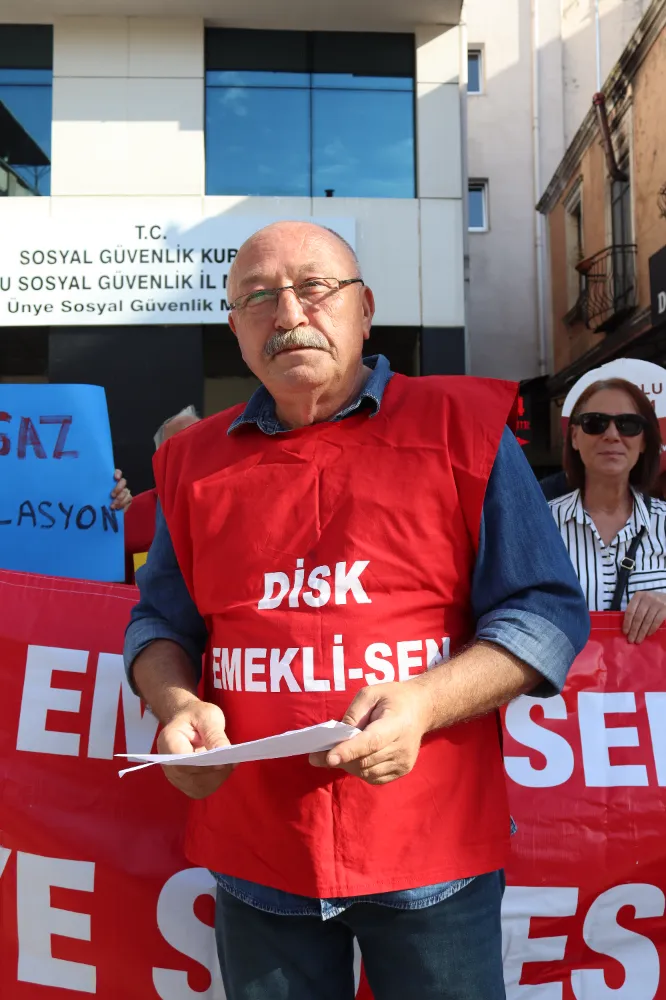 DİSK Emekli-Sen Ünye Şubesi üyeleri, TÜİK tarafından açıklanan 2025 yılının ilk 6 aylık enflasyon verilerine tepki göstermek amacıyla Dönerçeşme Meydanı’nda basın açıklaması gerçekleştirdi.