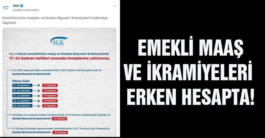 Sosyal Güvenlik Kurumu (SGK) emekli maaşı ve bayram ikramiyesi ödemelerinin başladığını duyurdu. Bugün yapılacak ödemeler 23 Haziran’a kadar devam edecek.