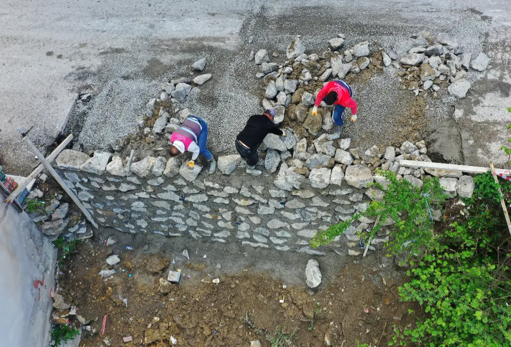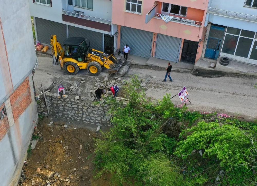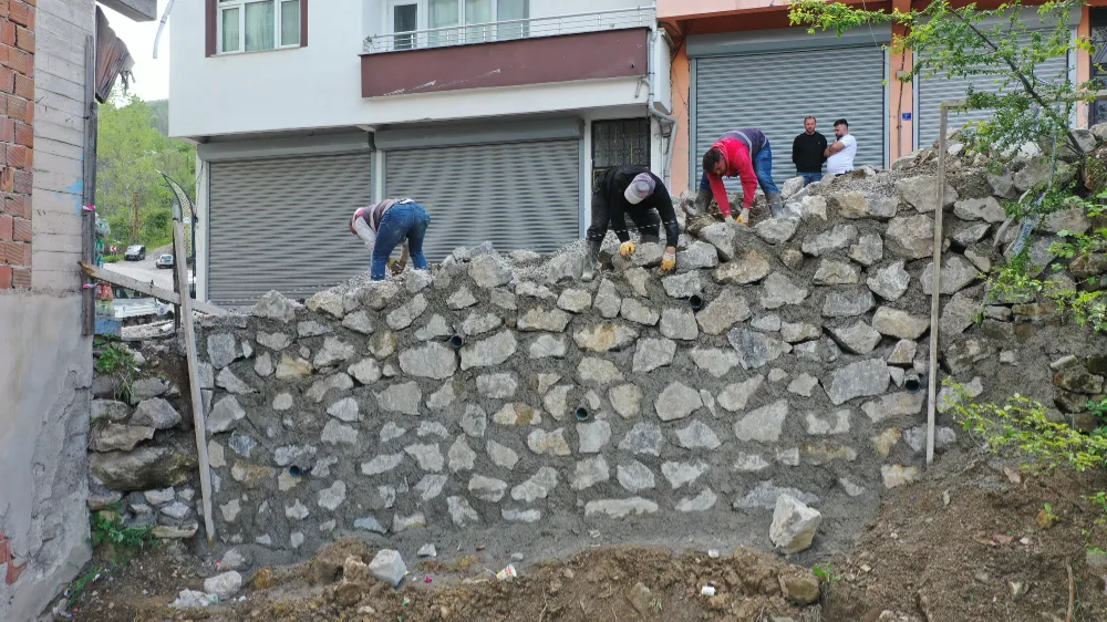 Ordu Büyükşehir Belediyesi ekipleri, yolun güvenliğini sağlamak ve heyelan tehlikesini ortadan kaldırmak amacıyla bölgede taş duvar çalışması yaptı.