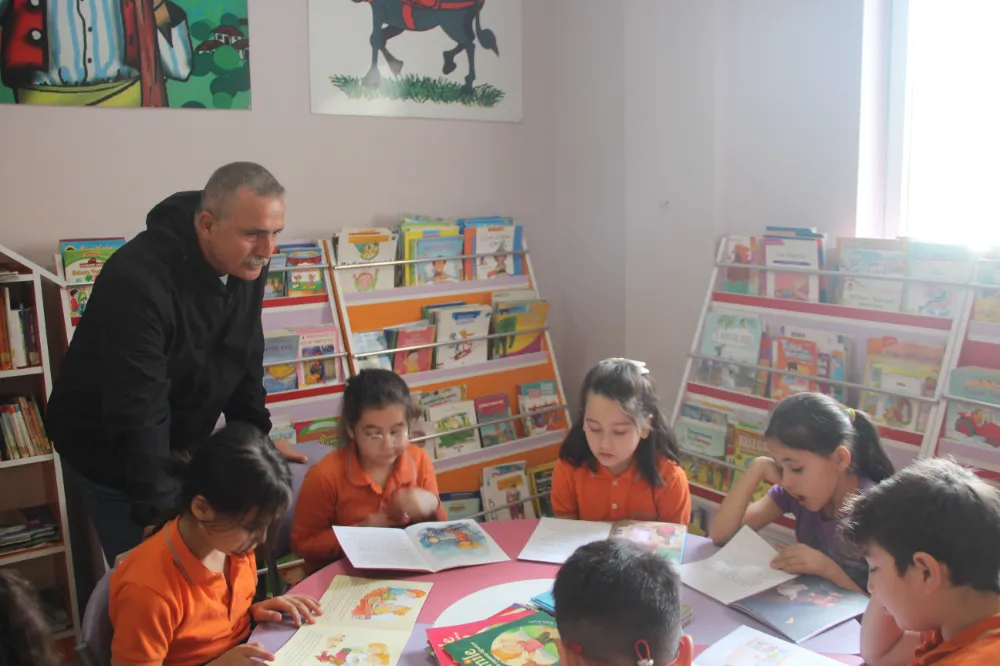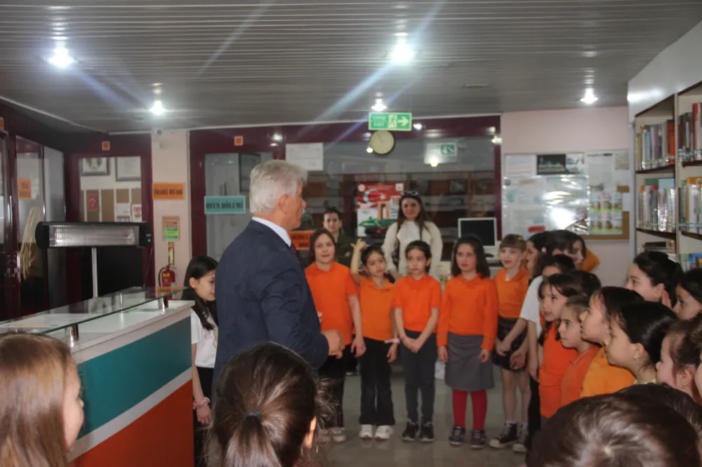 Kütüphane Müdürü Erol Kocaoğlu, ziyarette öğrencilere kütüphane ve kütüphanede yapılabilecek etkinliklere ilişkin bilgi verirken; küçüklerin merakla sordukları soruları da cevapladı.
