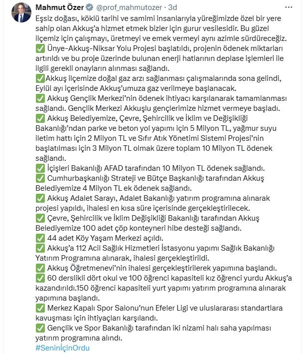 Akkuş’a değer katacak projeleri hayata geçirmeye devam edeceklerini vurgulayan Demirci, “Önceki dönem Milli Eğitim Bakanımız ve Ordu Milletvekilimiz Sayın Prof. Dr. Mahmut Özer’in destekleri bizler için çok kıymetli. İlçemizin ihtiyaçlarına en iyi şekilde cevap vermek için el ele vererek çalışmayı sürdüreceğiz. Akkuş’u daha ileriye taşımak için çalışıyoruz.” ifadelerini kullandı.