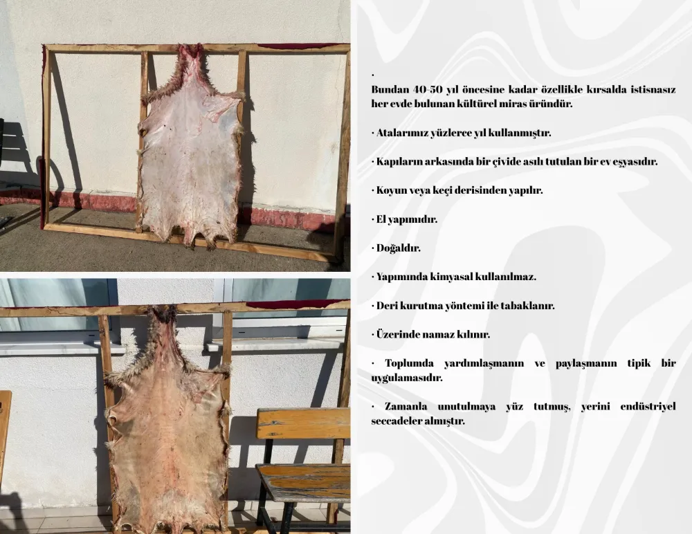 Namaz postunun koyun veya keçi derisinden yapılan, el yapımı ve tamamen doğal bir ürün olduğunu vurgulayan Kara, yapımında kimyasal madde kullanılmadığını, derinin tuzlanmadan ve tabaklanmadan doğrudan kurutulduğunu söyledi. Üzerinde namaz kılındığı için yerde bırakılmayan namaz postunun, genellikle odalarda kapı arkasındaki bir çiviye asılarak muhafaza edildiğini ve geçmişte pek çok evde bulunduğunu aktardı.
