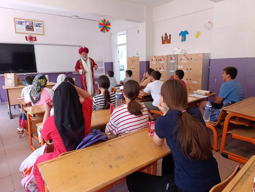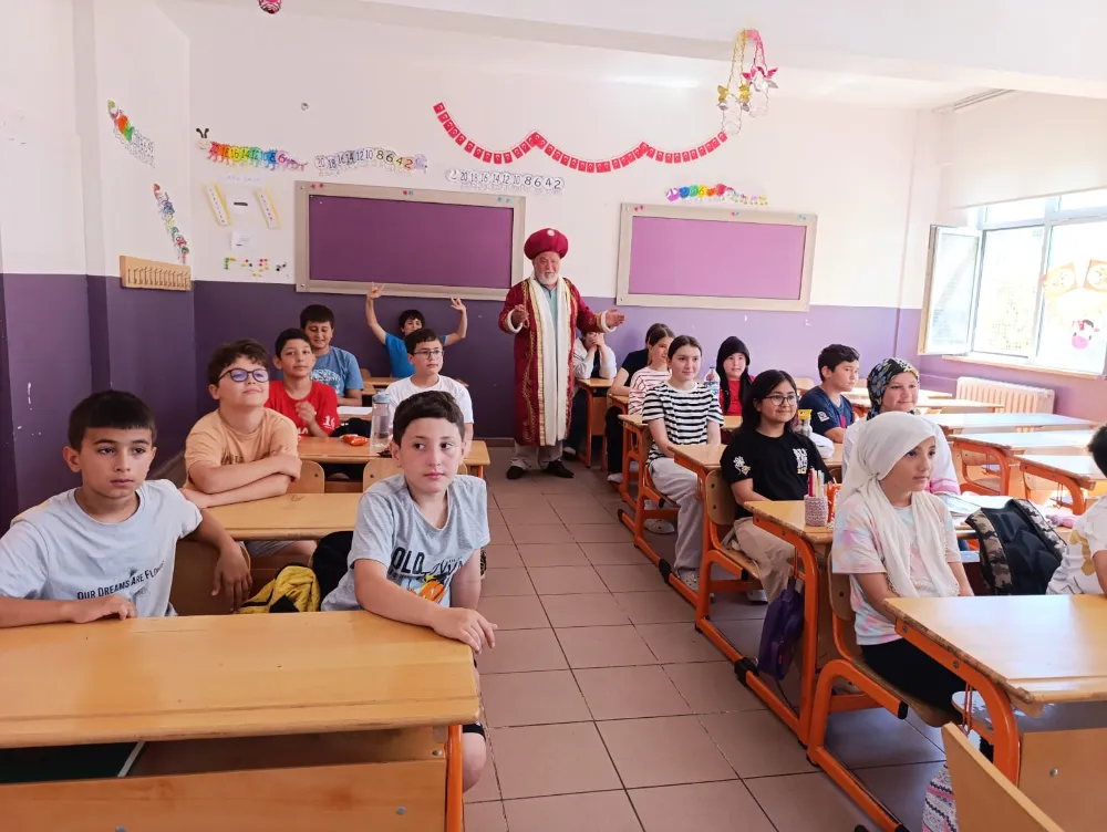 Anafarta İlkokulu'nda eğitim gören yaz okulu öğrencileri, geleneksel kıyafetleriyle sınıfları tek tek gezen Ateş’i karşılarında görünce şaşkınlık yaşadı. Yanında getirdiği tepsiyle öğrencilere çeşitli ikramlar dağıtan Ateş, esprili anlatımı ve Nasrettin Hoca fıkralarıyla sınıflarda keyifli anlar yaşattı.