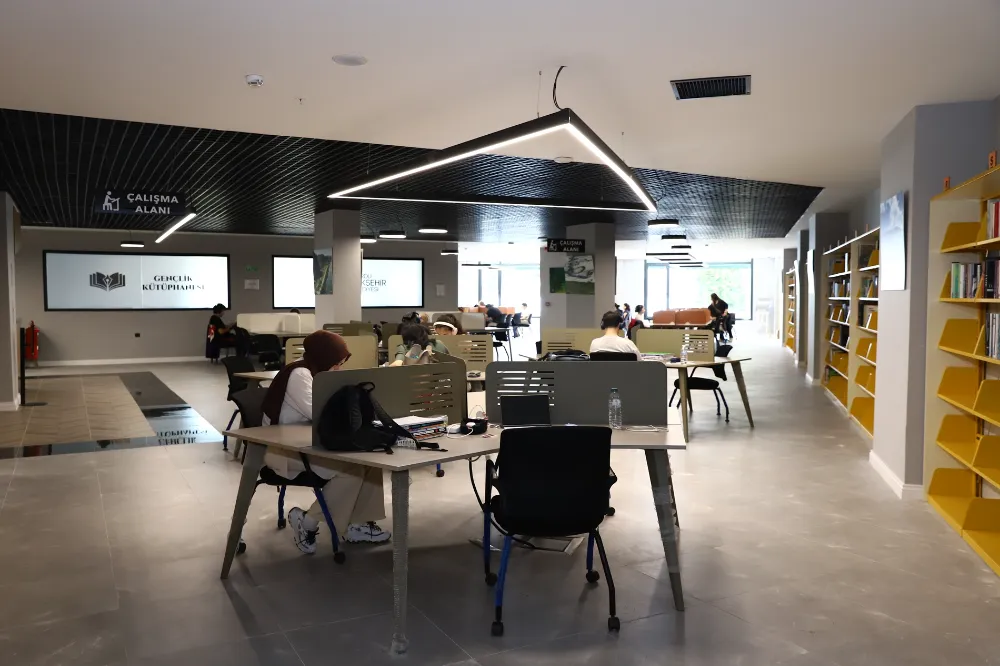 2 bin metrekarelik alanda donanımlı çalışma alanları, toplamda 2 bin metrekare alana yayılan Gençlik Kütüphanesi; küçük yaş gruplarına özel kitap okuma salonu, 60 kişilik bireysel çalışma alanı, 32 adet bilgisayar destekli bireysel çalışma bölümü, 70 kişilik grup çalışma alanı, 2 adet 25 kişilik kurs odası, kadın-erkek WC ve mescitler, fotokopi odası, gençlik kafeteryası ile öğrencilere hem bireysel, hem de grup çalışmaları için konforlu bir ortam sunuyor.