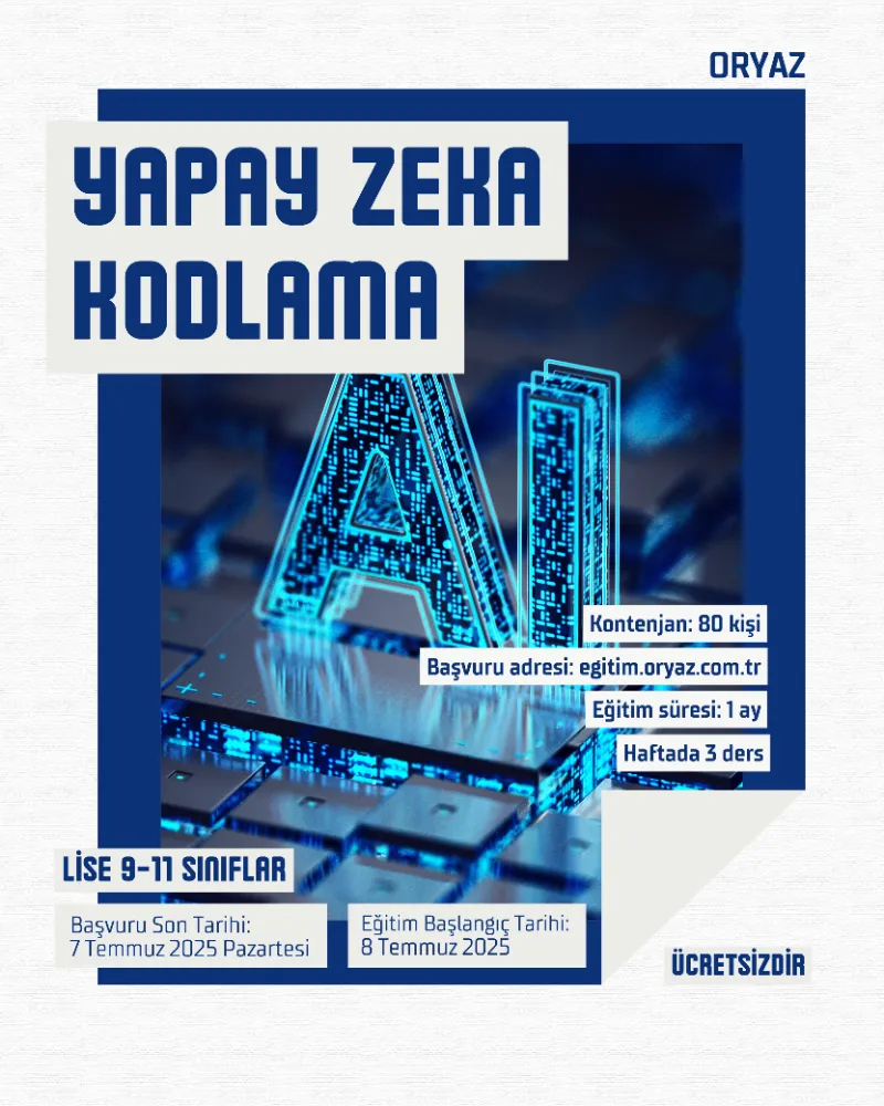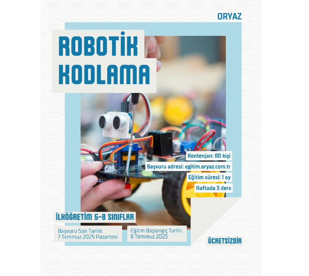 ORYAZ A.Ş. tarafından ilköğretim 5-8. sınıflar ve lise 9-11. sınıf öğrencilerine yönelik olarak düzenlenecek eğitim programlarında “Robotik Kodlama” ve “Yapay Zeka Kodlama” başlıklarında iki ayrı kurs verilecek. Eğitimler, 8 Temmuz’da başlayacak ve toplamda bir ay sürecek.