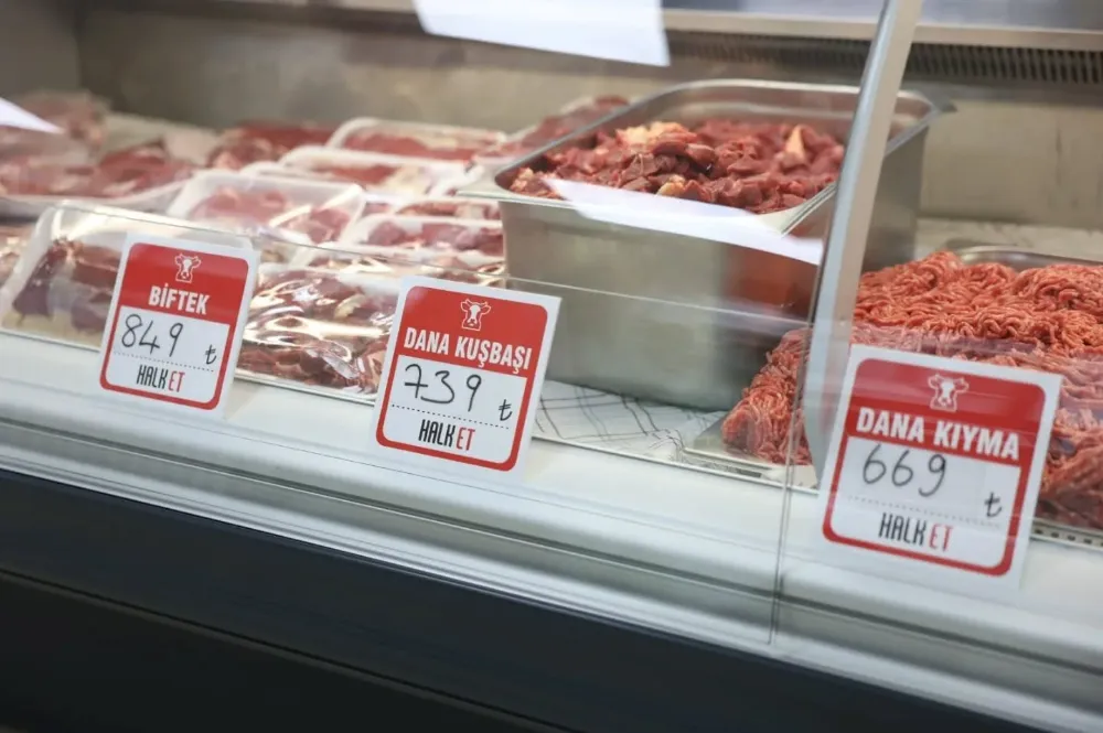 Halk Et Satış Noktasında ürünler şu fiyatlardan satışa sunuluyor; kıyma 689 TL, kuşbaşı 749 TL, biftek 849 TL, antrikot 889 TL, bonfile 1.189 TL, köfte 689 TL, kemikli dana eti 649 TL, ezme sucuk 649 TL.